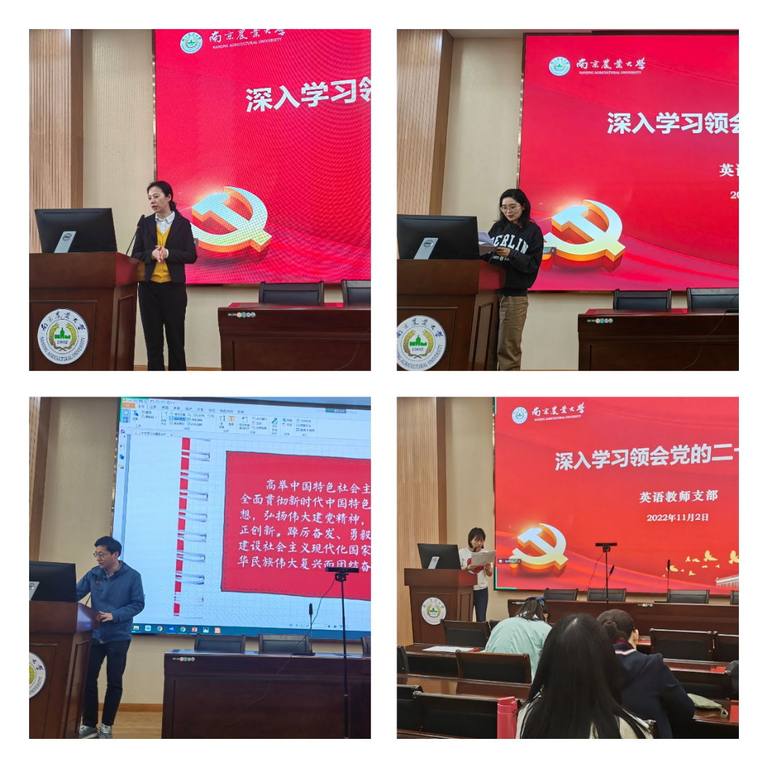 董红梅对参会的全体教师谈了三点感受:第一,坚持党的领导是办好中国特色社会主义大学的根本保证。只有坚持党的领导,坚持马克思主义指导地位,坚持为党和人民事业服务,落实立德树人根本任务,传承红色基因,才能走出一条建设中国特色世界一流大学的新路。第二,深入学习贯彻党的二十大精神,就要加快培养宽口径、厚基础的拔尖创新人才。二十大报告指出:教育、科技、人才作为现代化国家建设的重要支撑,科技是第一生产力,人才是第一资源,创新是第一动力,农业高校要始终胸怀国之大者,践行为党育人、为国育才的使命,把立德树人根本任务落到实处,培养德智体美劳全面发展的社会主义建设者和接班人。第三,作为高校教育工作者,为深化推进外语学科基础研究创新,既需要仰望星空,又需要扎根大地,坚持四个面向,聚焦国家重大战略需求,充分发挥外语优势,开展有组织科研,发掘发展自身动力,回应社会和国家需求,在全球的舞台上讲述有中国特色、南农情怀的故事,为实现中华民族伟大复兴贡献微薄之力。