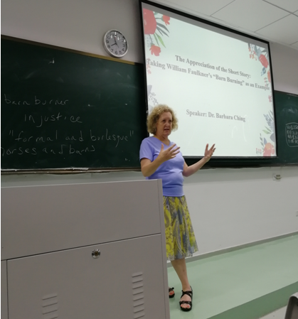 大三修读文学课的学生参加了本次工作坊,工作坊的主题是“The Appreciation of the Short Story: Taking William Faulkner’s ‘Barn Burning’as an Example”(威廉·福克纳短篇小说赏析——以《烧马棚》为例)。此次工作坊采取学生小组汇报、专家点评、问题探讨的形式,开启了一场别开生面的文学欣赏之旅。首先,来自两个班的三个小组代表分别从背景介绍、人物性格分析以及弗洛伊德心理分析视角下的父子关系解读等方面作了展示;然后Ching教授对几个小组的展示稍作点评,并以几个核心关键词,如:injustice(不公平)、horses and barns(马和马棚)、form and burlesque(形式与作戏)等从该短篇小说的文化背景出发,解读了其中鲜为人关注的细节,提供了文学批评以小见大的最好范例;最后,几位同学还就小说中的一些具体细节和开放式结局与Ching教授进行了良好的交流探讨。
