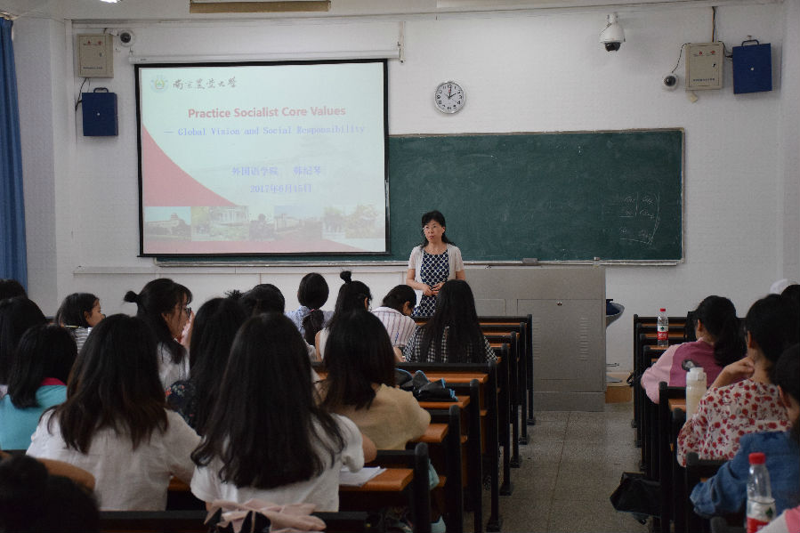 党委以“践行社会主义核心价值观——社会责任的培养”为主题的创新党课在教学楼A106开展。本次课程由学院党委书记韩纪琴教授主讲,全体2015级英语专业学生参加。