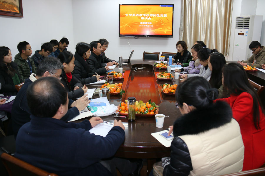 于2015年1月5日上午在教学楼E302学院会议室召开了大学英语教学改革师生座谈会。植保、动科、金融、食品等4个学院的教师代表和农学、植保、动科、食品、金融、人文、公管、园艺、农发等9个学院的学生代表应邀出席。座谈会由外语院副院长游衣明主持,副院长曹新宇和公共外语部各系负责人参加。