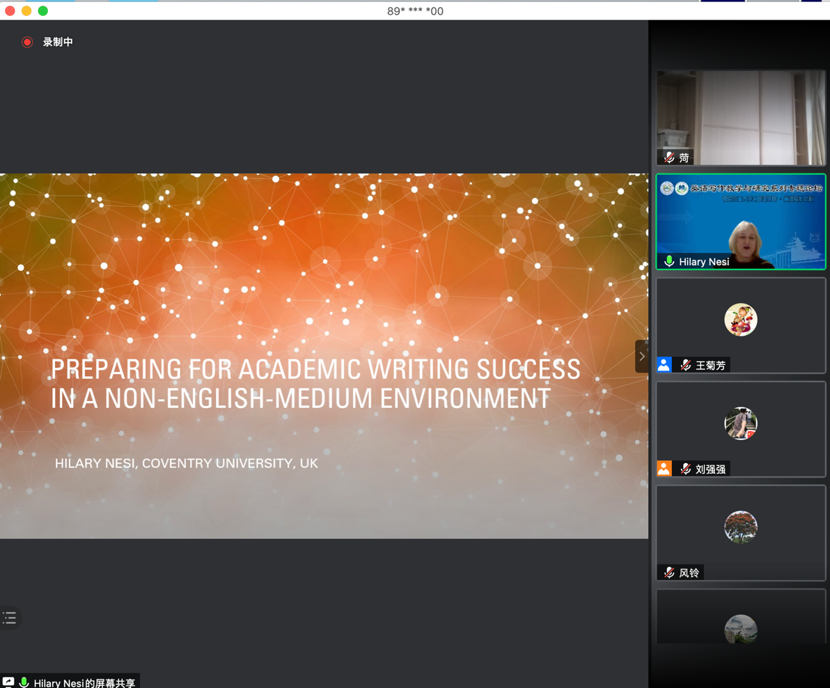 Hilary Nesi教授以“做好准备,谋求非英语媒介环境中成功的英文学术写作”(Preparing for Academic Writing Success in a Non-English-Medium Environment)为题做了主旨报告。她首先指出,设计专门用途英语(ESP)课程大纲始于细致分析学习者的多重目标语境。教师应使学习者具备适应不同语境(如:研究生学习、专业交流、科学研究等)的写作能力。随后,Nesi教授从语用学视角阐释了写作中的礼貌原则、参与者身份者与立场等,分析了提高学术写作能力的方法。她指出,写作技能的提高需要过程,要让学习者学会思考写作目的、分析写作任务、明确读者群体情况,从而逐渐提高学术写作能力。