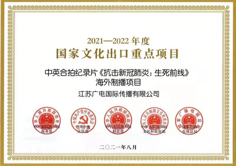 近期,江苏广电国际传播有限公司制作的中英合拍纪录片《抗击新冠肺炎:生死前线》海外制播项目,经商务部、中宣部、财政部、文化和旅游部、广电总局五部委联合评选认定,正式入选2021-2022年度国家文化出口重点项目。色情小说