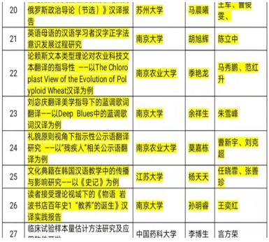 季艳龙同学的硕士学位论文《论赖斯文本类型理论对农业科技文本翻译的指导性—以The Chloroplast View of the Evolution of Polyploid Wheat汉译为例》(指导教师:马秀鹏教授,范红升导师);莫嘉栋同学的硕士学位论文《礼貌原则视角下指示性公示语翻译研究—以“残疾人”相关公示语翻译为例》(指导教师:曹新宇教授,刘克超导师)被评为江苏省优秀专业学位硕士学位论文。