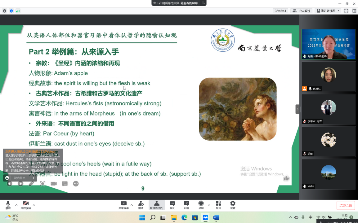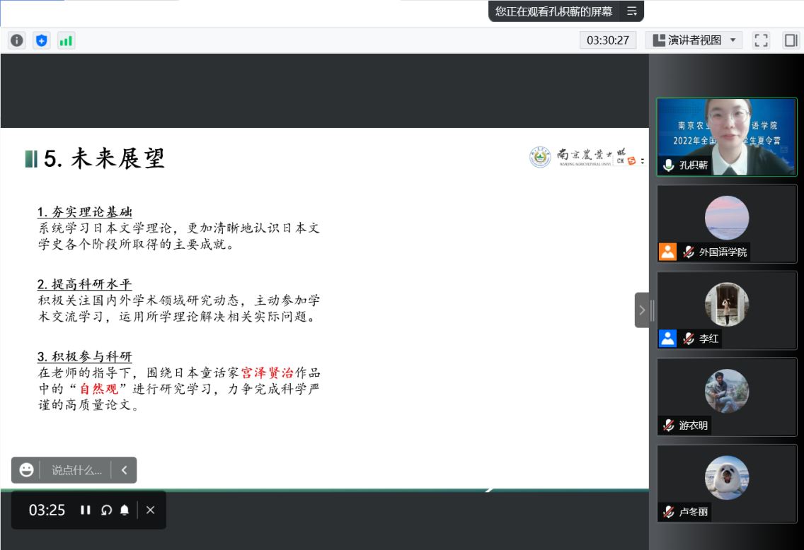 举行了夏令营闭营仪式。裴正薇宣读了优秀营员名单。八位营员代表作了发言,回顾了此次夏令营活动,交流了个人的感悟和思考,对学院提供学习交流平台表达了感谢。裴正薇在本次夏令营活动总结致辞中肯定了各位营员的综合实力,向所有营员表示祝贺,并激励大家始终保持团结友爱、求知进取、奋发有为的精神风貌。最后,她向各位同学发出邀请,欢迎大家选择美丽的南农校园深造学习。夏令营闭营仪式由副院长游衣明主持。