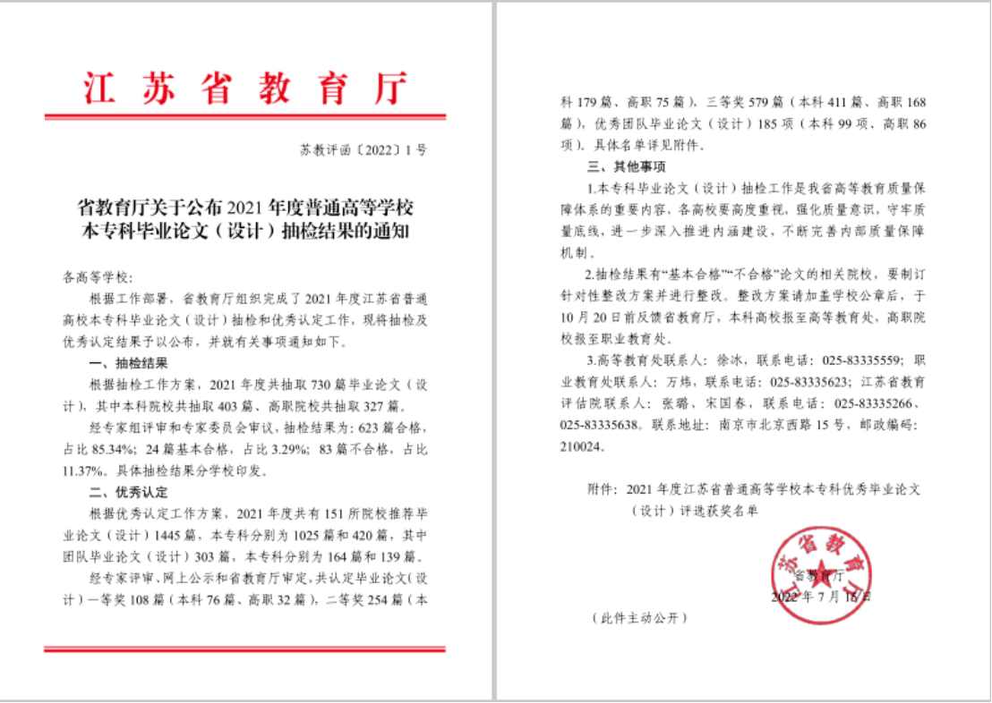 近日,江苏省教育厅公布了2021年度普通高等学校本专科毕业论文(设计)抽检和优秀认定结果。色情小说