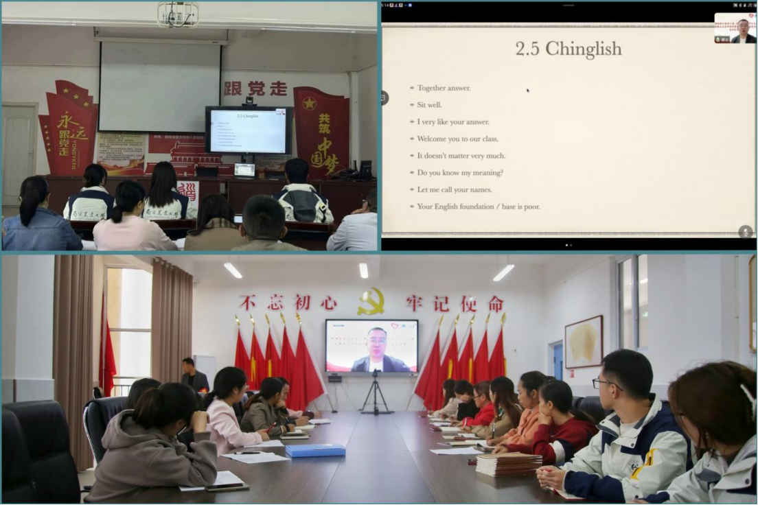 钱正霖首先做教师课堂话语的专题交流。他从课堂话语功能、常见问题和正确用法等三个方面,为麻江县的语文和英语教师讲解了课堂教学中的教师话语。钱正霖针对英语教师在课堂中可能出现的搭配不正确、半英半中表达、中式英语表达等用语问题,针对性列举了多种对话情境,如:询问迟到或缺席、表达赞赏、给予学生建议或祝福、分配课堂任务等。麻江县的教师们积极参与了线上练习,朗读范句,现场学习氛围热烈。