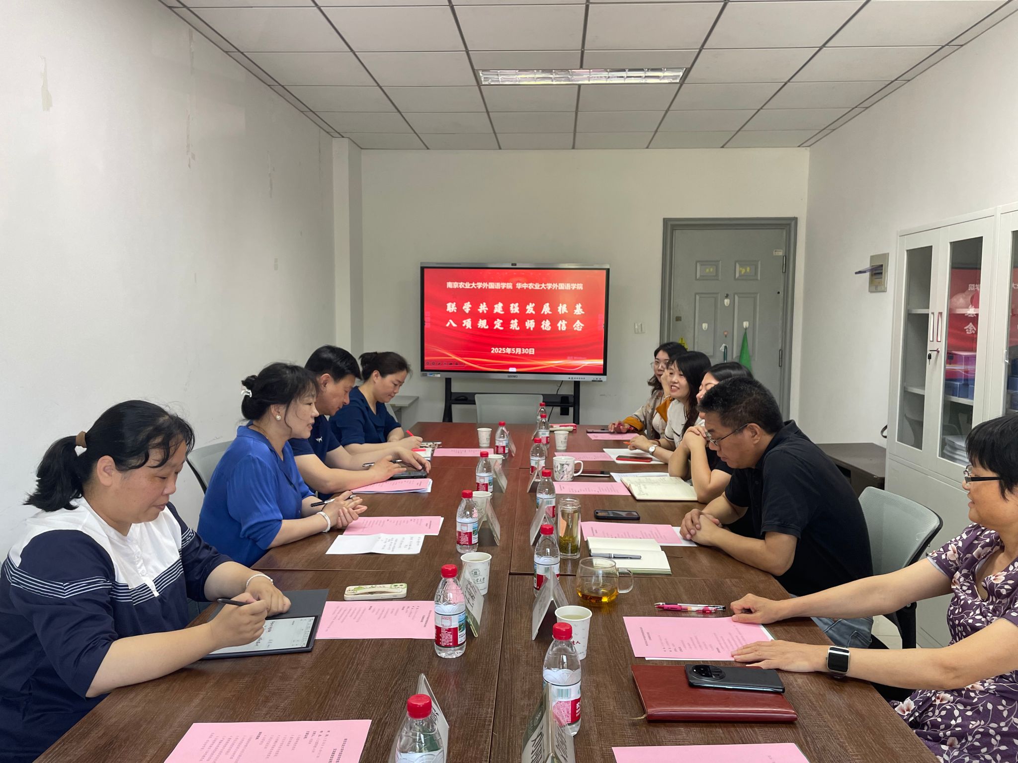 活动伊始,双方聚焦学习主题,围绕中央八项规定精神的核心要义、师德师风建设等进行了交流。与会人员紧密联系工作实际,探讨如何将中央八项规定精神切实转化为推动事业发展的根本动力。董红梅从两所学校的共性与差异出发,强调了当前环境下交流调研在推动外语教育改革和外语学科发展的意义。方红详细介绍了华农外院的整体情况,从学科布局、师资队伍到教学科研成果,全面展现了学院的发展现状与特色优势。马秀鹏则围绕南农外院的建设情况,分享了学院在学科发展、人才培养等方面的实践经验与创新举措。冯国林对于华农外院发展具体工作的路径、方法和发展框架进行了总结和分享。