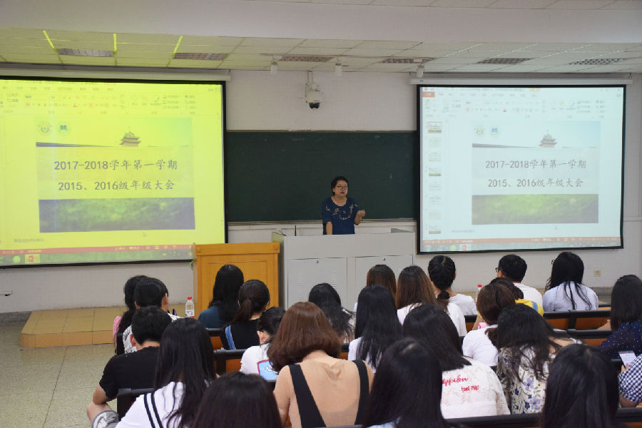 于教学楼C301举行了本学期年级大会。院党委副书记董红梅,英语系裴正薇老师,日语系万枫老师、全体辅导员和全体2015级和2016级学生。大会由董红梅书记主持,各位老师围绕新学期专业学习和学生工作进行了详细讲解。