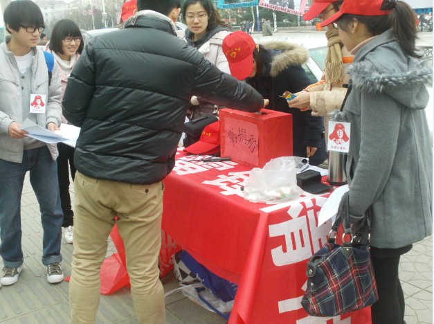 本次活动为期两天,志愿者们共计24人,分为两大组,第一组已于昨天在新街口募捐完毕,第二组志愿者们今天下午在卫岗苏果社区店展开行动。此次活动采取“一个阵地募捐,多个阵地宣传”的形式。下午1点钟左右,志愿者们已经就位,在超市门口设立了募捐点,在各大人群密集处分发传单,并向路人宣传介绍关于募捐活动的相关内容,耐心地解答路人的疑惑。不少路人解囊相助,并在横幅上签字以示支持。捐助者既有年过七旬的老人,也有在父母陪同下咿呀学语的孩童;捐助金额从一元的硬币到几百元不等。志愿者们都一一鞠躬致谢,“爱心不分多少”,每一位捐助者都会得到一张志愿者们亲手制作的纪念书签。由于募捐在室外进行,气候条件十分恶劣,然而路人的爱心温暖了每一位志愿者。