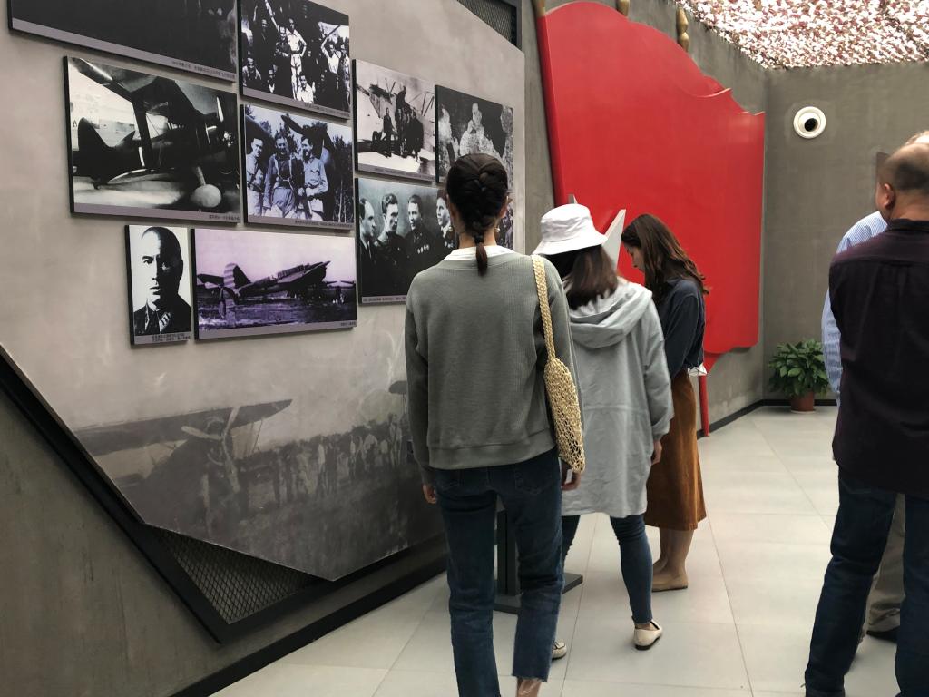 在党员同志的带领下,团队成员从纪念馆西门进入。首先各成员参观了“正义之神”大型雕塑,其“三头六臂,神情坚毅,骑在飞虎之上,手持弓箭奋力向上射去”的整体造型象征着国际反法西斯统一战线的战无不胜的力量。随后他们依次参观了“奋勇抗敌”、“国际援华”、“壮志凌云”和“缅怀先烈”四个主题纪念展厅。在航空英雄陈怀民的介绍墙面前,大家列队肃立,满怀崇高敬意,向英勇牺牲的爱国英雄默哀致敬。