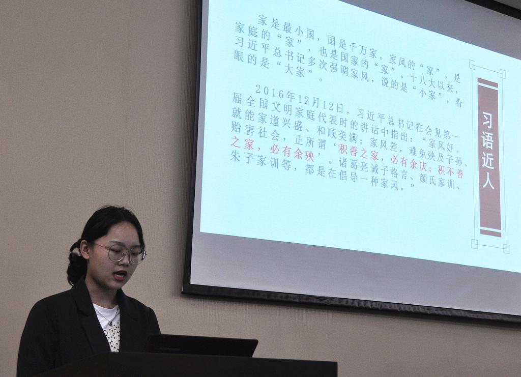 汤智贤同志对入党教育培训系统学习平台中《平语近人》栏目进行了汇报,她以家风为核心,围绕“积善之家必有余庆”展开,着重介绍了良好的家风对社会主义核心价值观的影响,以及如何弘扬家风中的核心价值观。