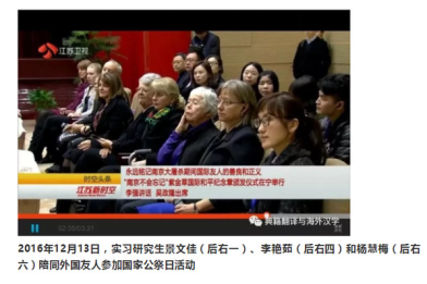 王银泉教授的指导下,2015级翻译专业学位研究生景文佳、李艳茹、杨慧梅、杨苗苗、刘娜娜、郭静等六人前往侵华日军南京大屠杀遇难同胞纪念馆开展实习工作。实习工作分为两个阶段进行,第一阶段为协助纪念馆进行资料整理、讲解接待、史料翻译和公示语纠错等,共整理资料1,183份资料,翻译资料达23000余字。同时,将存在翻译错误的38处公示语标识收集整理并提出改正译文提交至纪念馆有关部门,推动完善纪念馆公共标识语译文整改工作。第二阶段为参与第三个国家公祭日的接待工作。活动期间,他们分头全程陪同各自负责接待陪同的外籍友人家庭,参与了“紫金草国际和平纪念章”颁发仪式和《南京不会忘记》新书发布会,同时协助江苏电视台对外籍人士进行采访。在国家公祭日当天,景文佳、李艳茹、杨慧梅三位同学全程陪同这些外籍友人参加活动,在低温阴雨的天气条件下,坚持同外籍友人一起参加在侵华日军南京大屠杀遇难同胞纪念馆举办的烛光祭活动,为大屠杀遇难同胞亡灵祈福,全程陪同外籍友人参观拉贝故居。