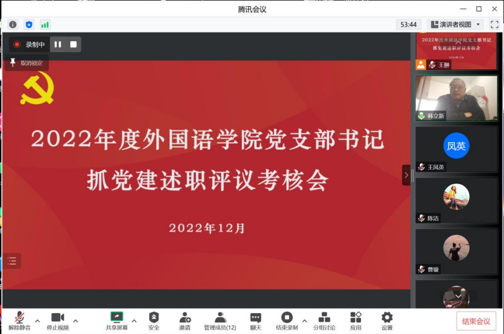 2022年度党支部书记抓党建述职评议考核工作进行了总结。她首先对各党支部2022年度开展的党建工作给予了高度评价。她说,各党支部紧紧围绕专业特色、教学科研、思政工作开展了有特色的党建,取得了很好的效果,展现出了外语院的良好精神面貌。她指出,近年来外语院留学归国教师多,要注重发挥留学归国青年教师的积极性和创造性,进一步营造良好的工作环境和氛围。她强调,外语院是教学大院,是学校立德树人的重要窗口,要持续抓好支部党建工作,不断探索特色党建活动,加强党建工作创新。